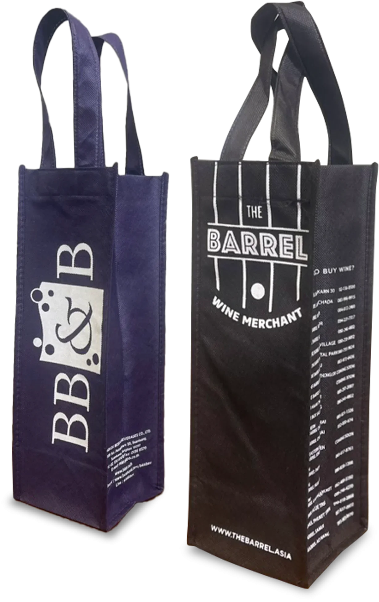 ถุงผ้าสำหรับใส่ขวดไวน์ เหมาะสำหรับใส่ขวดไวน์ซึ่งทำให้ง่ายและสะดวกต่อการพกพาไปยังสถานที่ต่างๆ การใช้ถุงไวน์นั้น นอกจากจะช่วยปกป้องขวดไวน์แล้ว ยังช่วยป้องกันแสงจากภายนอกไม่ให้มากระทบกับขวดไวน์โดยตรง ช่วยรักษาอุณหภูมิของไวน์ไม่ให้เปลี่ยนแปลงเร็วจนเกินไป ซึ่งอาจจะส่งผลต่อรสชาติและคุณภาพของไวน์ การใช้ถุงผ้าใส่ขวดไวน์จึงช่วยแก้ปัญหาตรงนี้ได้เป็นอย่างดี